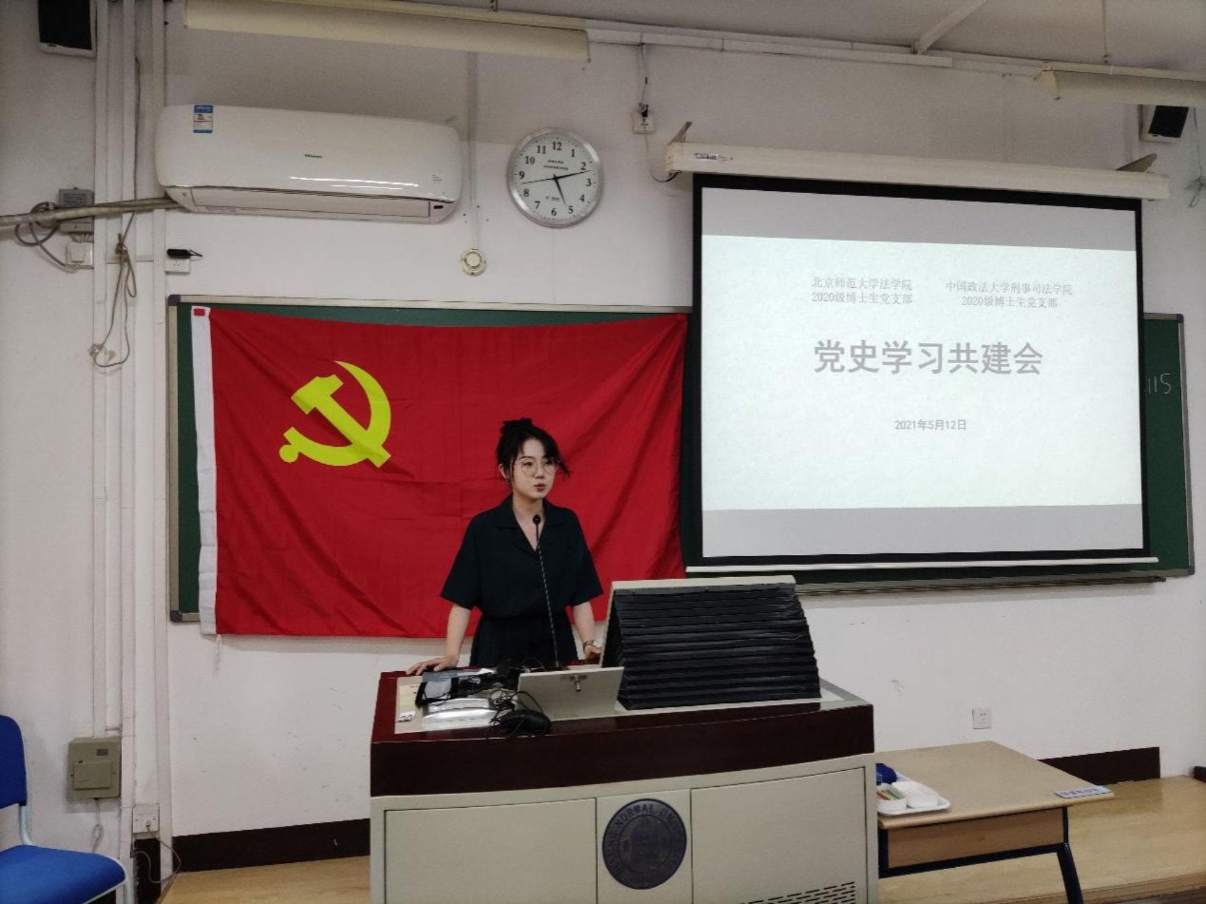 接着,中国政法大学刑事司国产精品 2020级博士班党支部书记李涵笑同志致辞,李书记代表本支部对北师大同学们的热情接待表示感谢,并希望两支部可以从本次活动开始共建共荣,团结协作举办更多更好的党建活动。