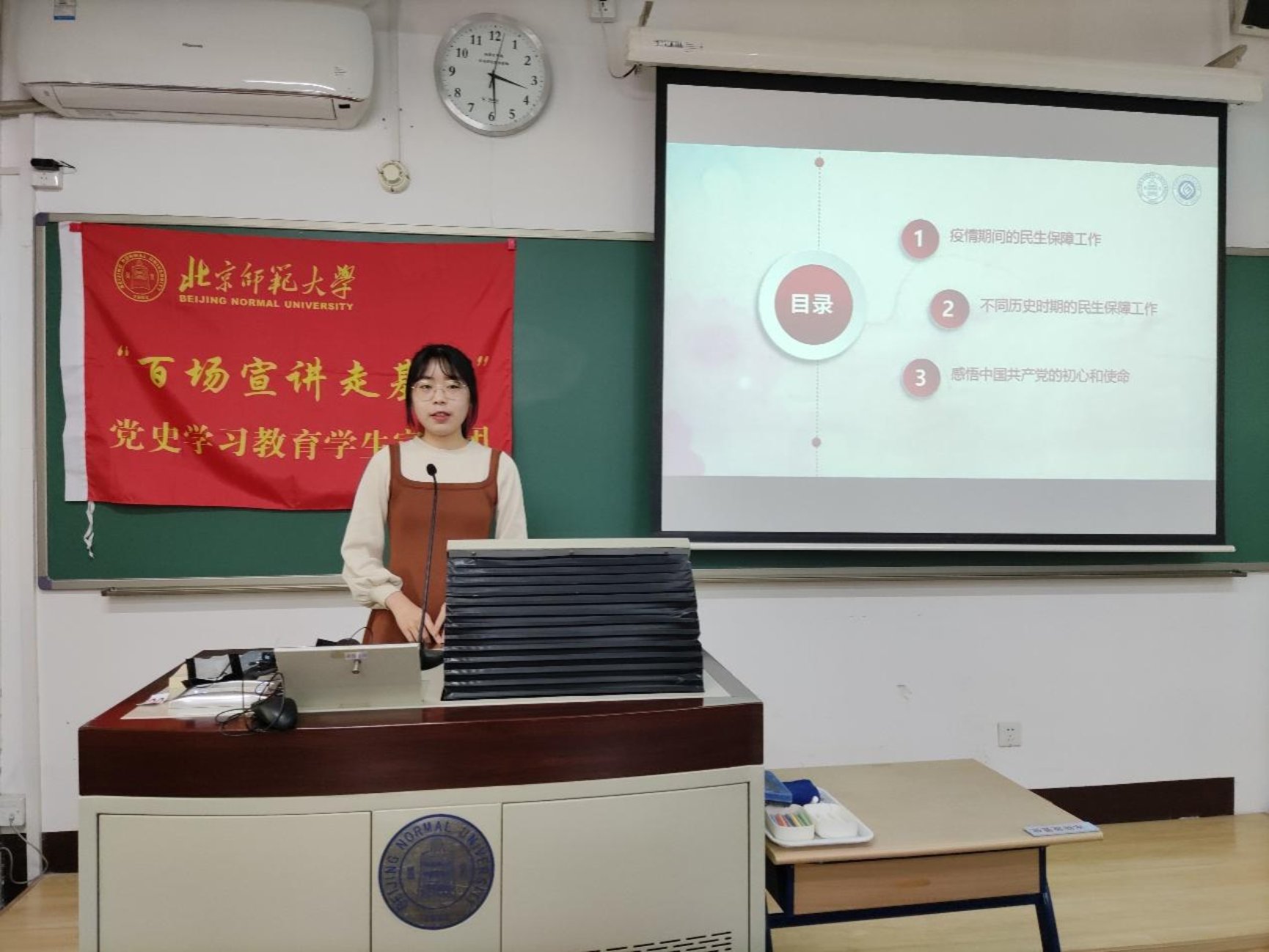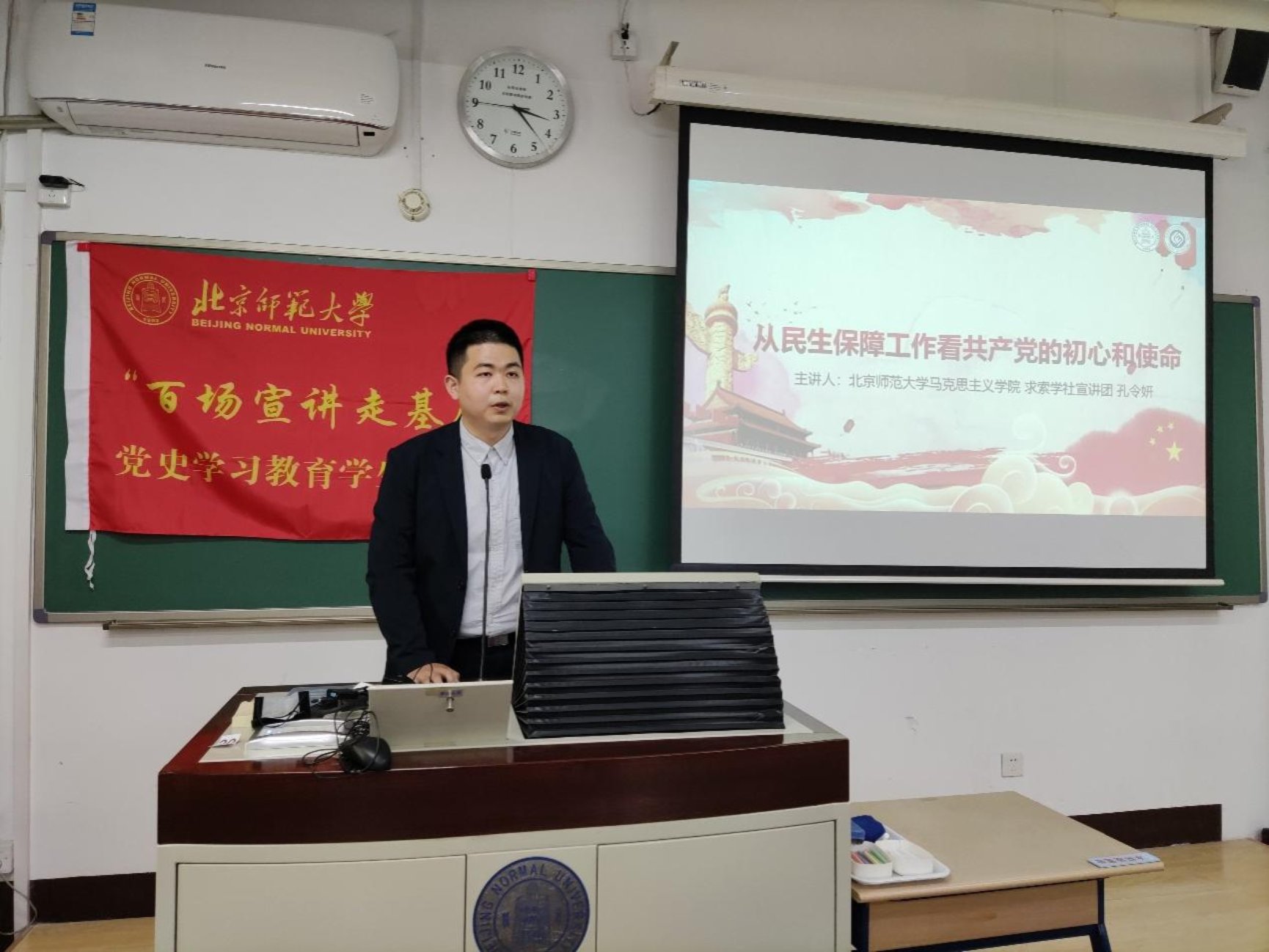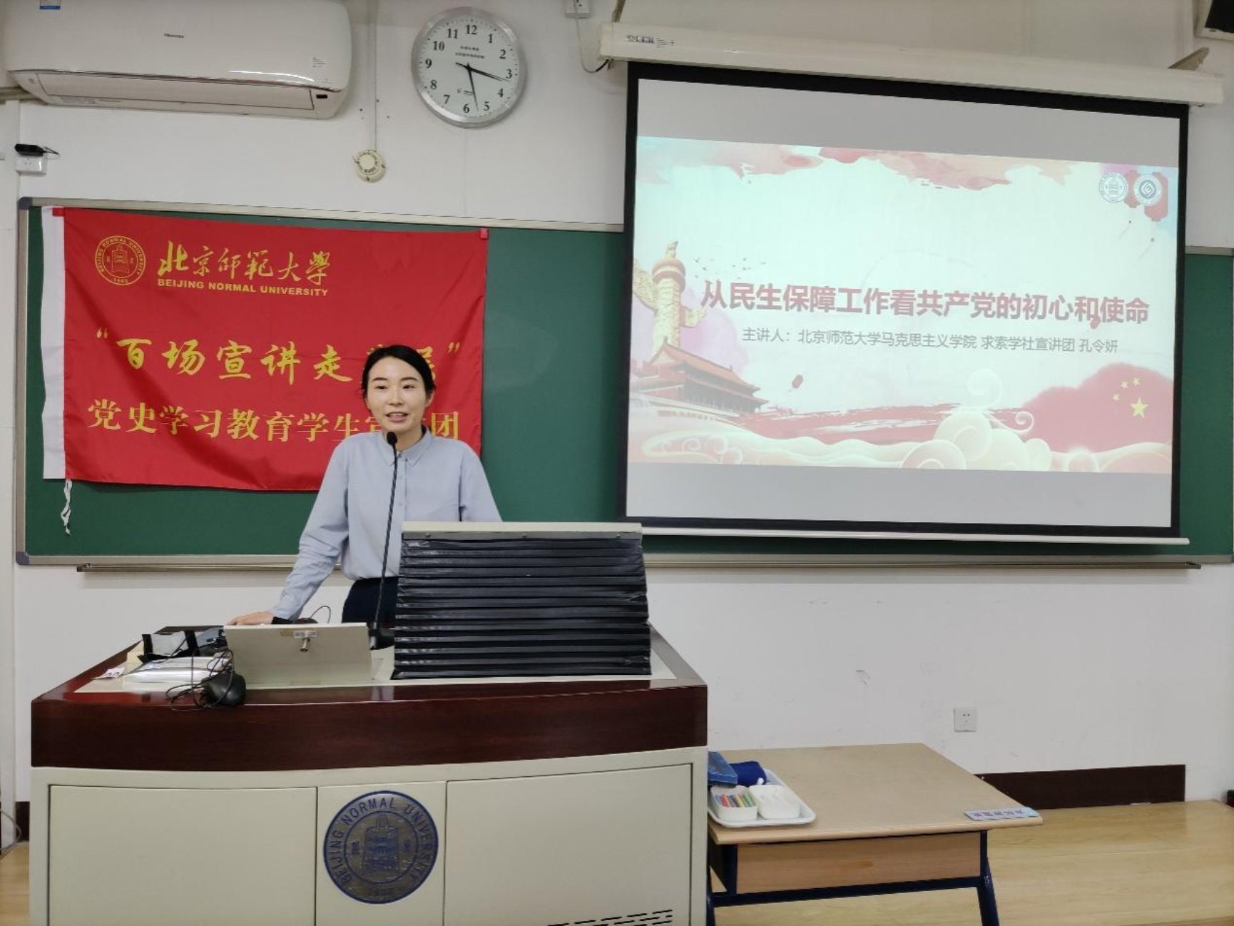 然后,来自国产精品 马克思主义国产精品、求索学社宣讲团的孔令妍同志进行了以《从民生保障工作看共产党的初心和使命》为题为大家进行了主题宣讲。孔同志从疫情期间的民生保障工作、不同历史时期的民生保障工作和感悟中国共产党的初心和使命三个角度完成宣讲,让在场的各位同志更深刻地认识到我们党是一以贯之坚持初心的党,党的一切工作都是从人民利益出发,从人民利益着想,我们作为青年党员要认识到自己的使命,要敢于担当,善于担当。