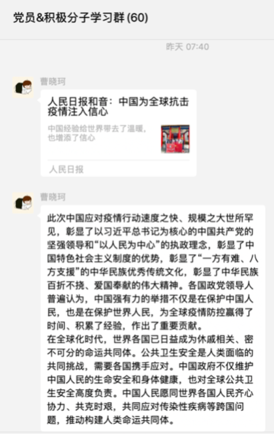 景曼珂:在疫情面前,无数党员干部带领广大人民群众一起,坚决贯彻党中央的指示要求,积极响应号召,主动在抗疫一线接受考验,充分发挥了先锋模范作用。我们要向奉献在抗疫一线的党员们学习,严格要求自己,贡献自己的力量。我们要坚信,只要我们万众一心,疫情的阴霾终将会驱散,我们必将取得防控疫情的最终胜利。