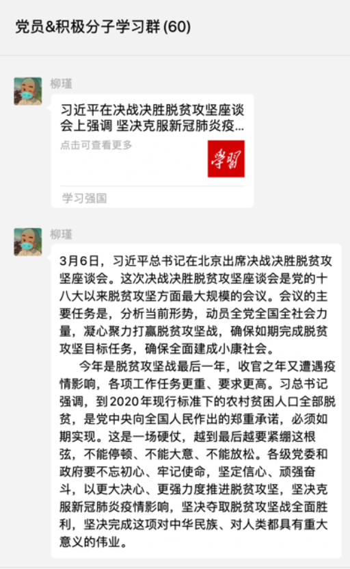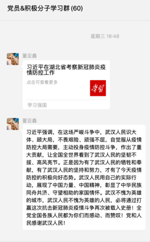 此外,为严格落实疫情防控期间党的组织生活制度,2019级法律硕士第一党支部一直努力把“支部建在线上,行动落到线下”,在疫情防控期间积极组织党员和入党积极分子运用“学习强国”、微信群等网络平台进行学习和网上交流,实现线上线下同步走,宅在家里也能学,通过各种线上的平台,丰富了党员和入党积极分子们学习交流的形式。