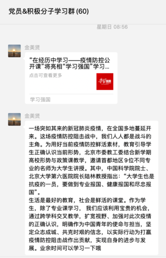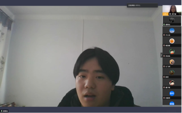 金美贤:在本次大会中,我们通过小组汇报的形式学习习近平总书记的最新理论知识。作为学生党员,在特殊时期,我们更要一如既往地不折不扣落实国家要求,做好线上学习工作的同时,实时跟进新思想、新理念的学习和理解,为打赢疫情防控阻击战而提供强有力的保障。