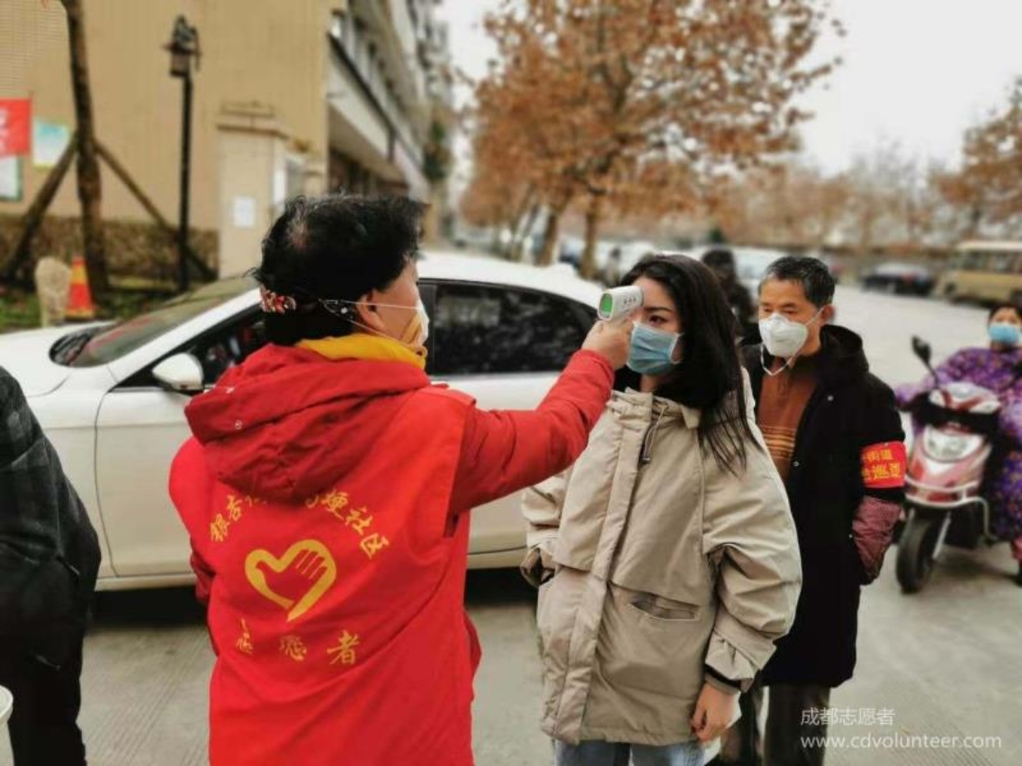 志愿者测量出入社区人员的体温。(图片来源于网络)