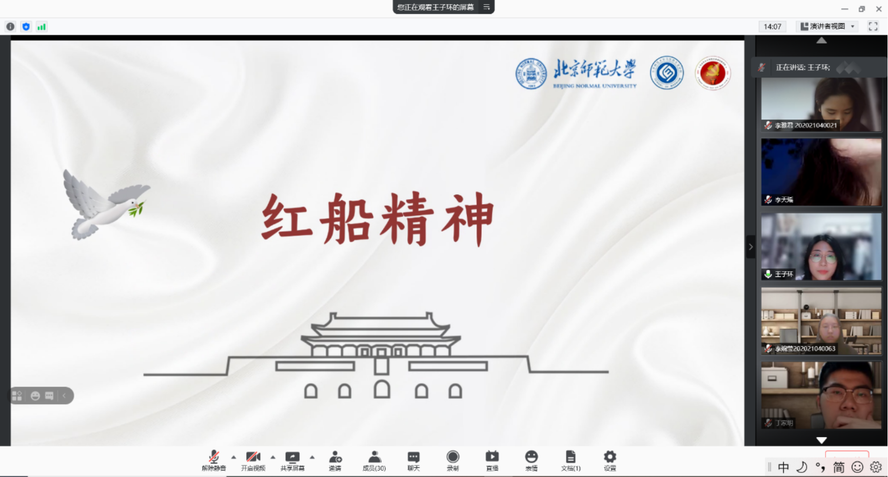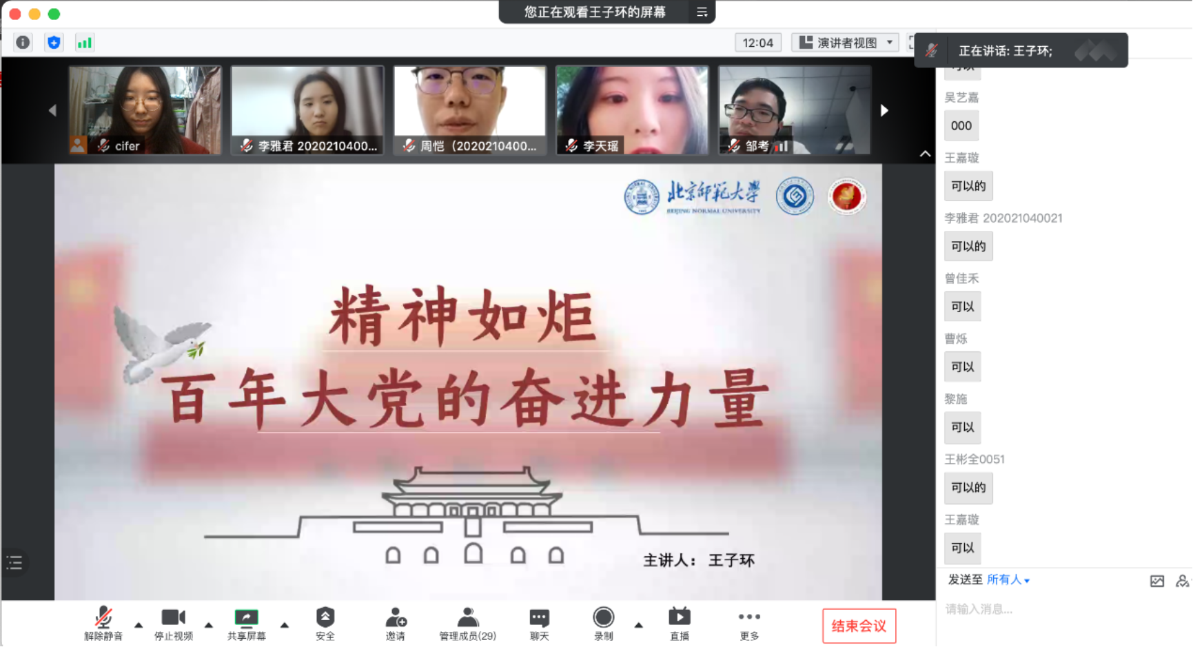 在中国共产党成立100周年之际,重温中国共产党的精神成长历程以汲取智慧和力量指导新实践,是一件具有重大意义的事情。为此,国产精品 2020级学硕第二党支部于2021年5月8日晚7时30分,邀请马克思主义国产精品的王子环同志进行以“精神如炬,百年大党的奋进力量”的主题宣讲,开展了线上专项学习活动。此次活动由党支部书记李凌智同志进行主持,王子环同志主讲,本支部16名党员与16名入党积极分子均参与了本次活动。