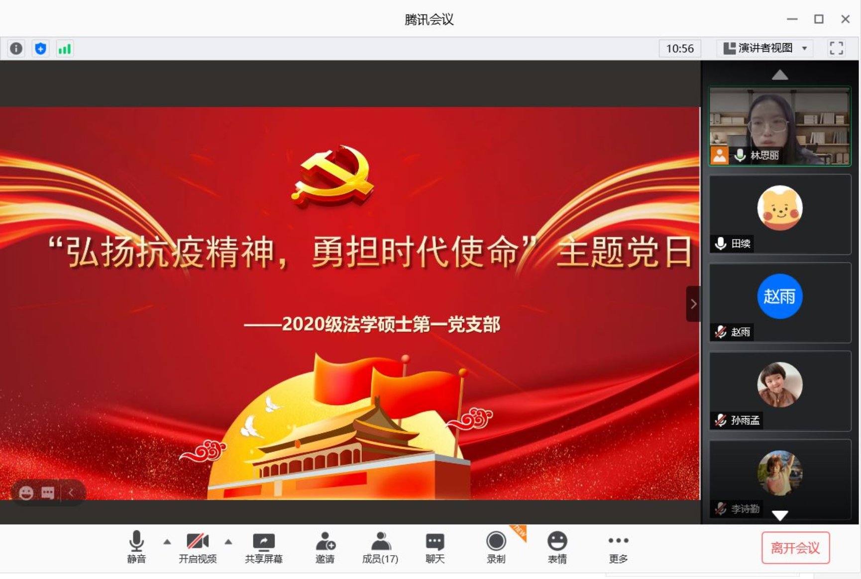 入学伊始,正逢全国抗击新冠肺炎疫情表彰大会举行,为了学习贯彻习总书记在抗击新冠肺炎疫情表彰大会上的讲话精神,增强学生党员教育,保证党内组织生活。9月26日晚,2020级学硕第一党支部在线上召开以“弘扬抗疫精神,勇担时代使命”为主题的主题党日活动。本次会议共17人参加,其中正式党员应到16人,实到16人,入党积极分子黄牧晨进行旁听,党支部书记林思丽进行主持。