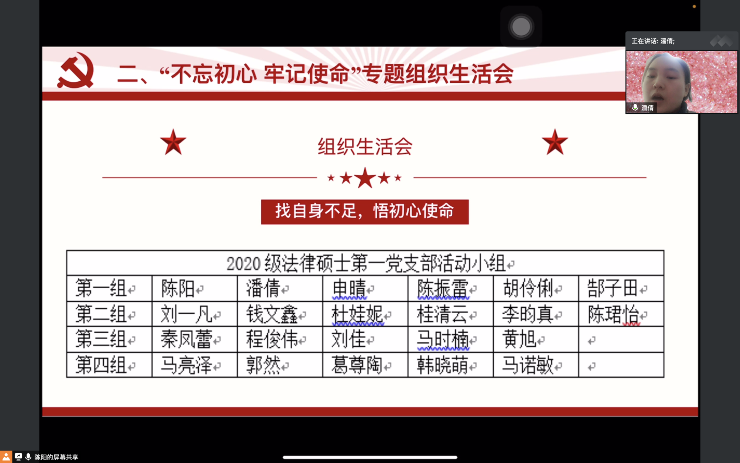 2021年3月3日,国产精品 2020级法硕第一党支部通过腾讯会议组织开展了支部全体党员大会暨“不忘初心,牢记使命”专题组织生活会,本次会议共有22名正式党员参加,会议由党支部书记陈阳主持,国产精品 党委副书记郭雅婷老师莅临本次会议。