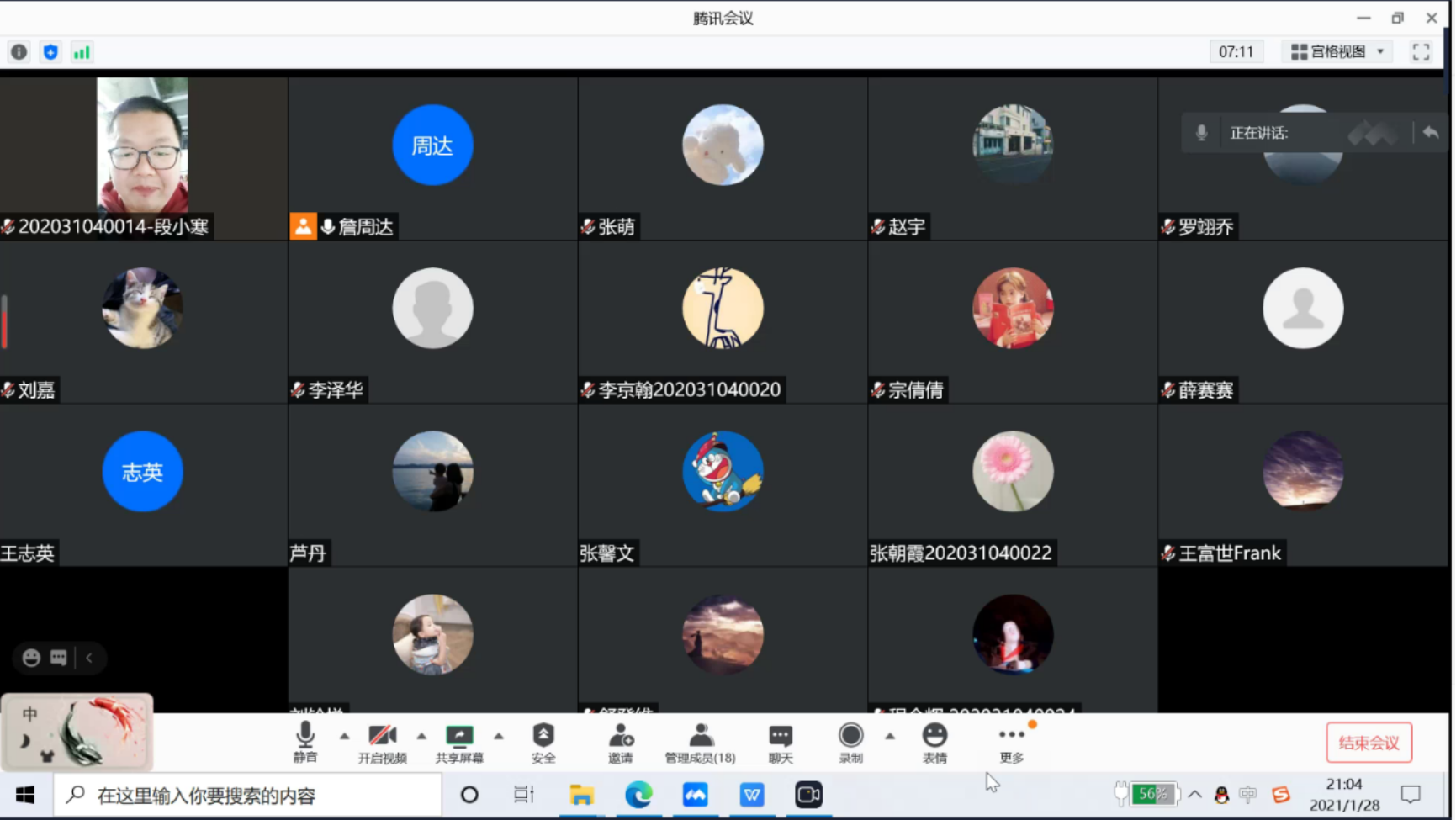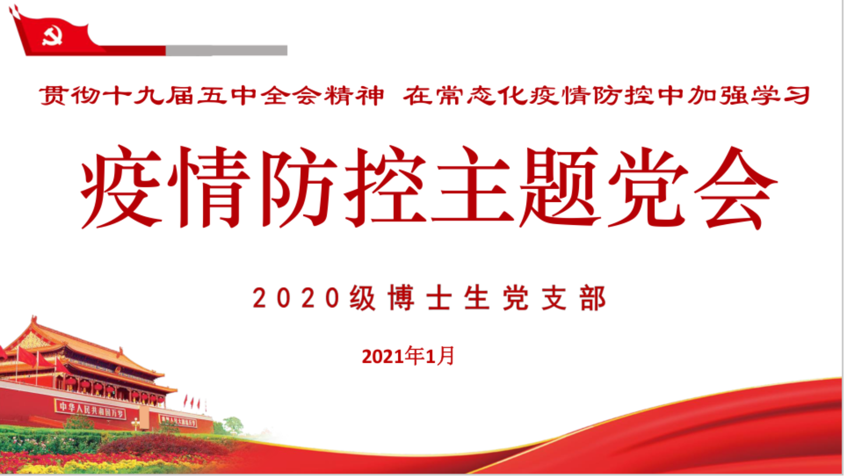 为贯彻落实十九届五中全会精神,在常态化疫情防控中加强学习,让同学们在寒假期间保持学习热情、坚持日常防疫,按照学校和国产精品的党建工作部署,国产精品 2020级博士生党支部于2021年1月29日21:00通过腾讯会议以线上方式召开了疫情防控主题党会。本支部的正式党员和积极分子20名同志准时参会,支部书记詹周达同学主持会议。