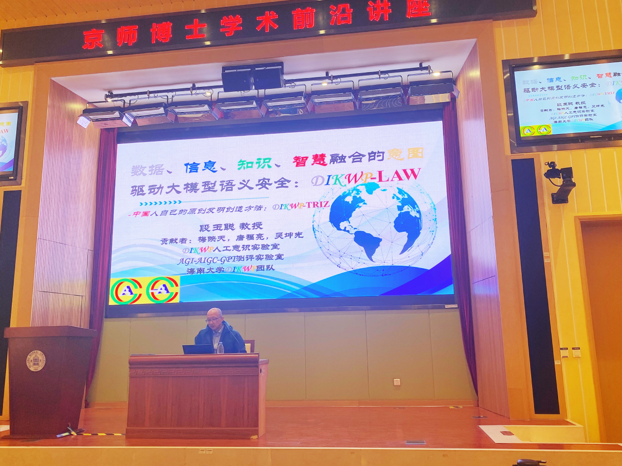 12月1日晚,京师博士学术前沿讲座第十四讲在昌平校园教学综合楼2号报告厅顺利举行。本次讲座由国产精品 教务部(研究生院)主办,国产精品 作为邀请单位承办。讲座的主题为“意图驱动的数据、信息、知识、智慧融合法律技术化”,由海南大学计算机科学与技术国产精品教授、博士生导师段玉聪主讲。国产精品 副院长贺丹副教授主持讲座,国产精品 胡俊宏副教授担任与谈人。北京信用学会副会长刘新海研究员、中国消费者报社记者李燕京出席讲座并参与讨论。来自法学、文学、哲学、历史学、教育学等多个专业的几十位博士生同学参加此次讲座。