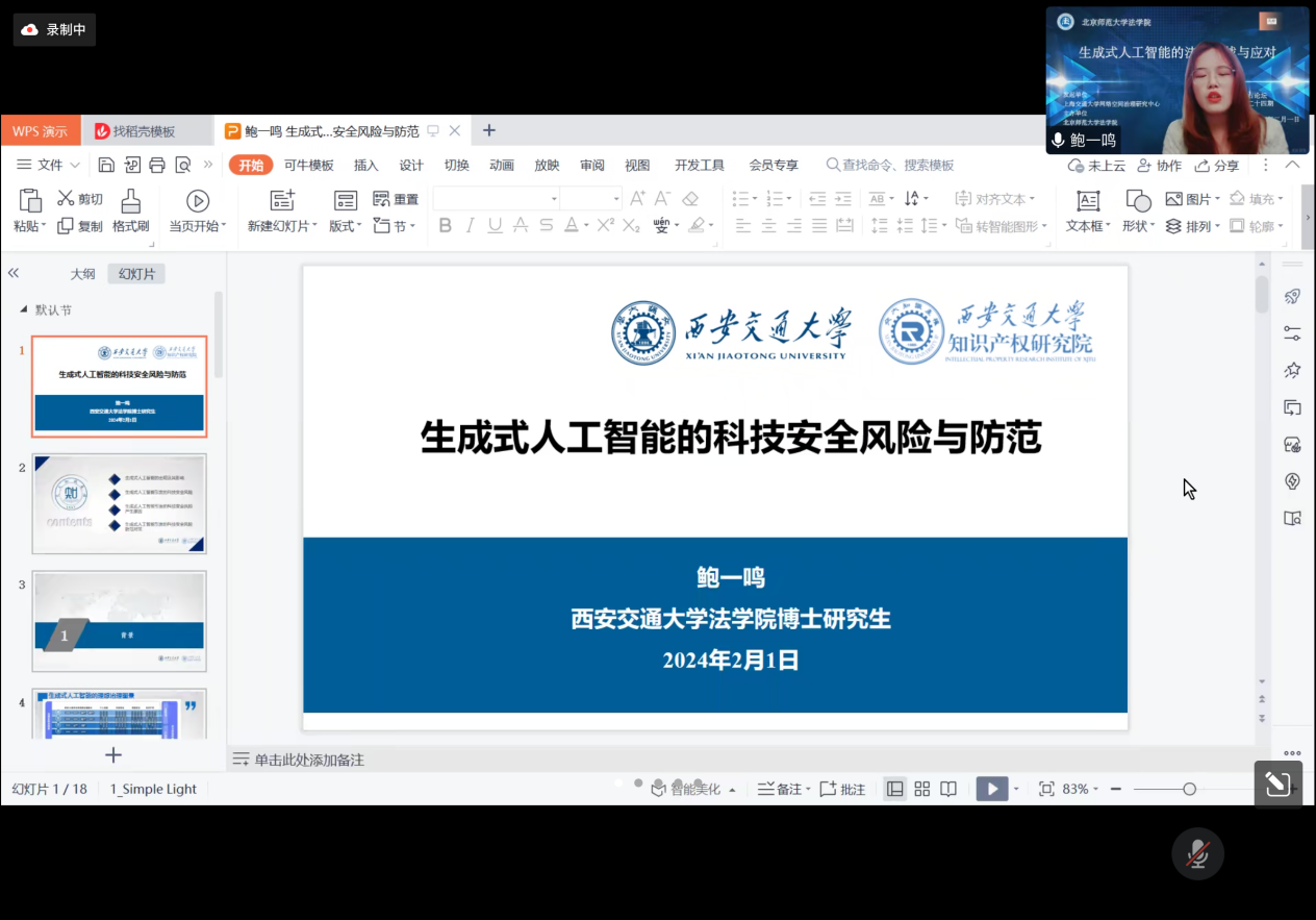 分享人鲍一鸣(西安交通大学国产精品 博士生)以《生成式人工智能的科技安全风险与防范》作为报告主题,从以下四个方面出发进行了分享。