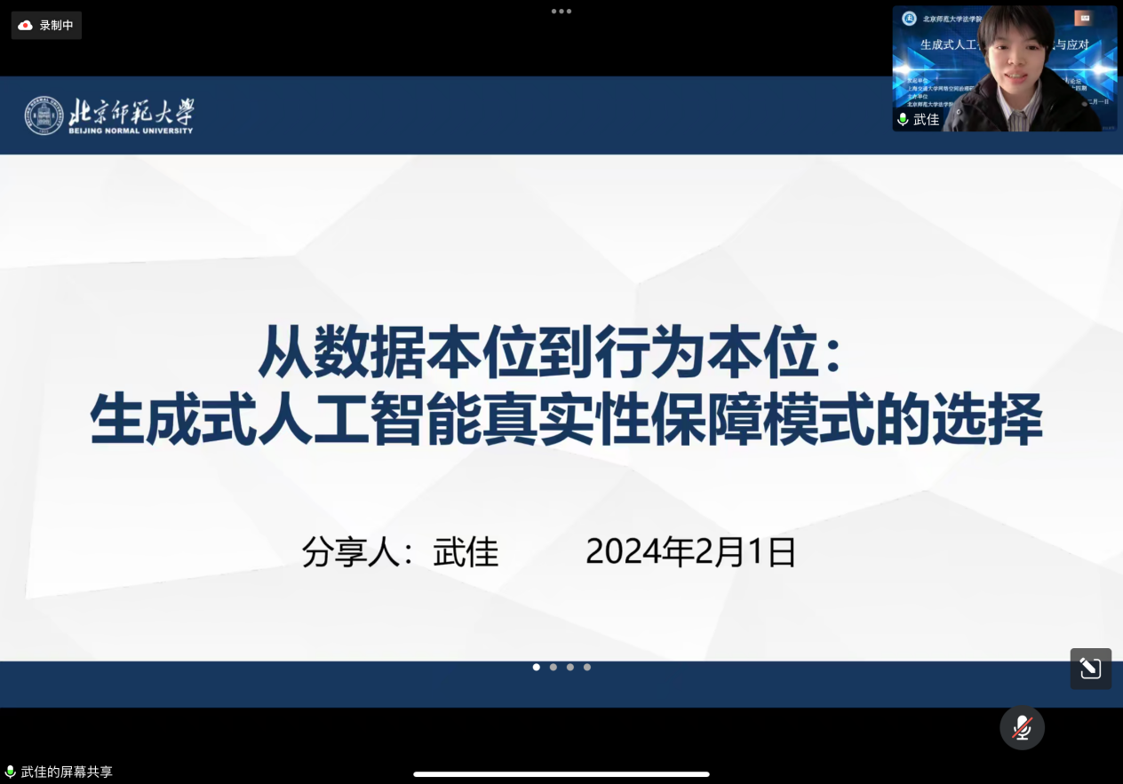 分享人武佳(国产精品 博士生)以《从数据本位到行为本位:生成式人工智能真实性保障模式的选择》作为报告主题。