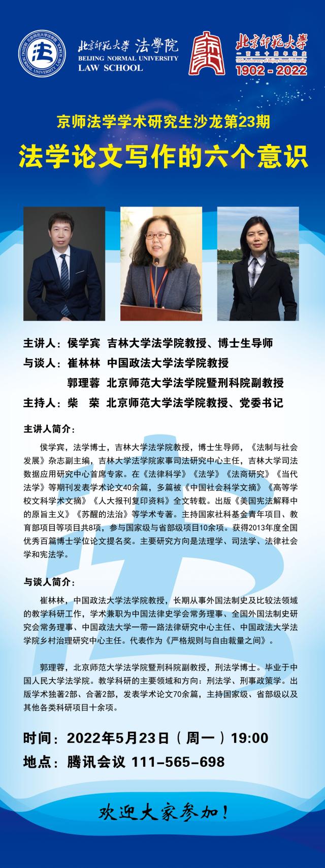 【05.23】京师法学学术研究生沙龙第23期:法学论文写作的六个意识/主讲人:侯学宾