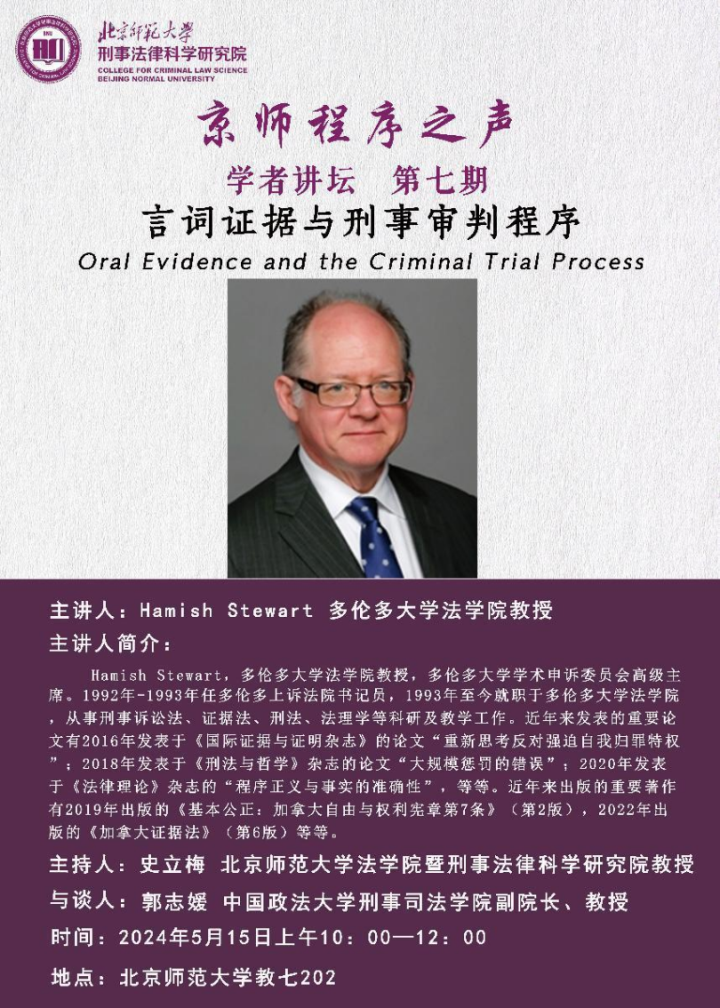 5月15日,“京师程序之声”学者讲坛第七期在国产精品 教七202成功举行。本期学者讲坛由多伦多大学国产精品 教授Hamish Stewart主讲,主题为“言词证据与刑事审判程序(Oral Evidence and the Criminal Trial Process)”。中国政法大学刑事司国产精品 副院长郭志媛教授作为与谈人参与本次学者讲坛。国产精品 法学院史立梅教授、杨超副教授、严泽岷博士后以及来自刑事诉讼法学专业的博士研究生、硕士研究生、本科生共计八十余人参加了本次讲坛。讲坛由史立梅教授主持。