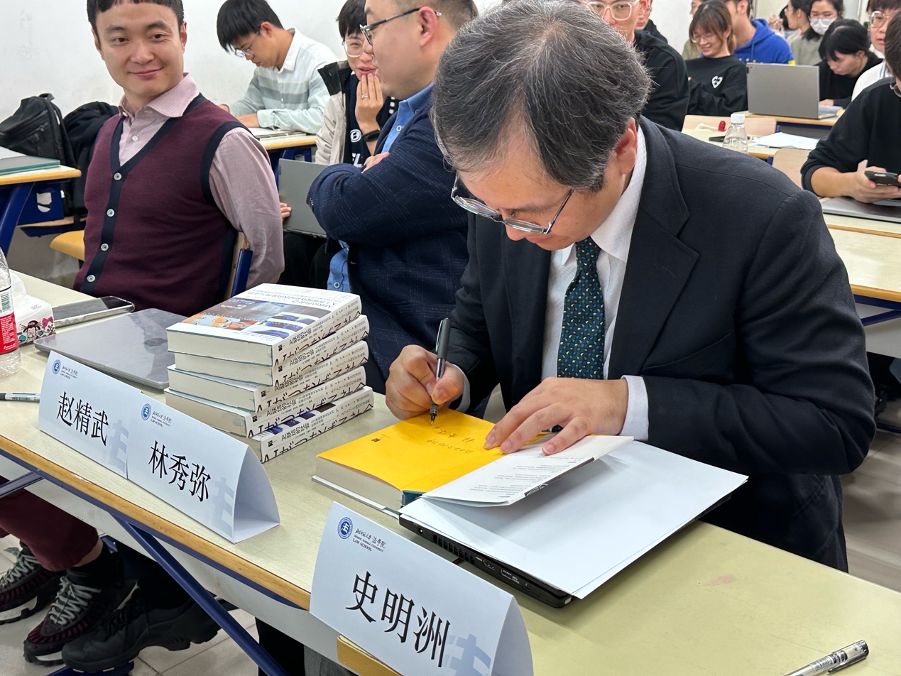 在同学提问环节中,讲座现场的同学们积极向林教授提出自己的疑问,包括日本立法过程中是否是用了ChatGPT、使用者是否需要学习相关技术、ChatGPT是否带来了新的风险等问题,林教授进行了一一回复,解答了同学们的疑问。提问环节结束后,林老师将亲笔签名的编著《AI联结的社会》赠与各位嘉宾和提问的同学。