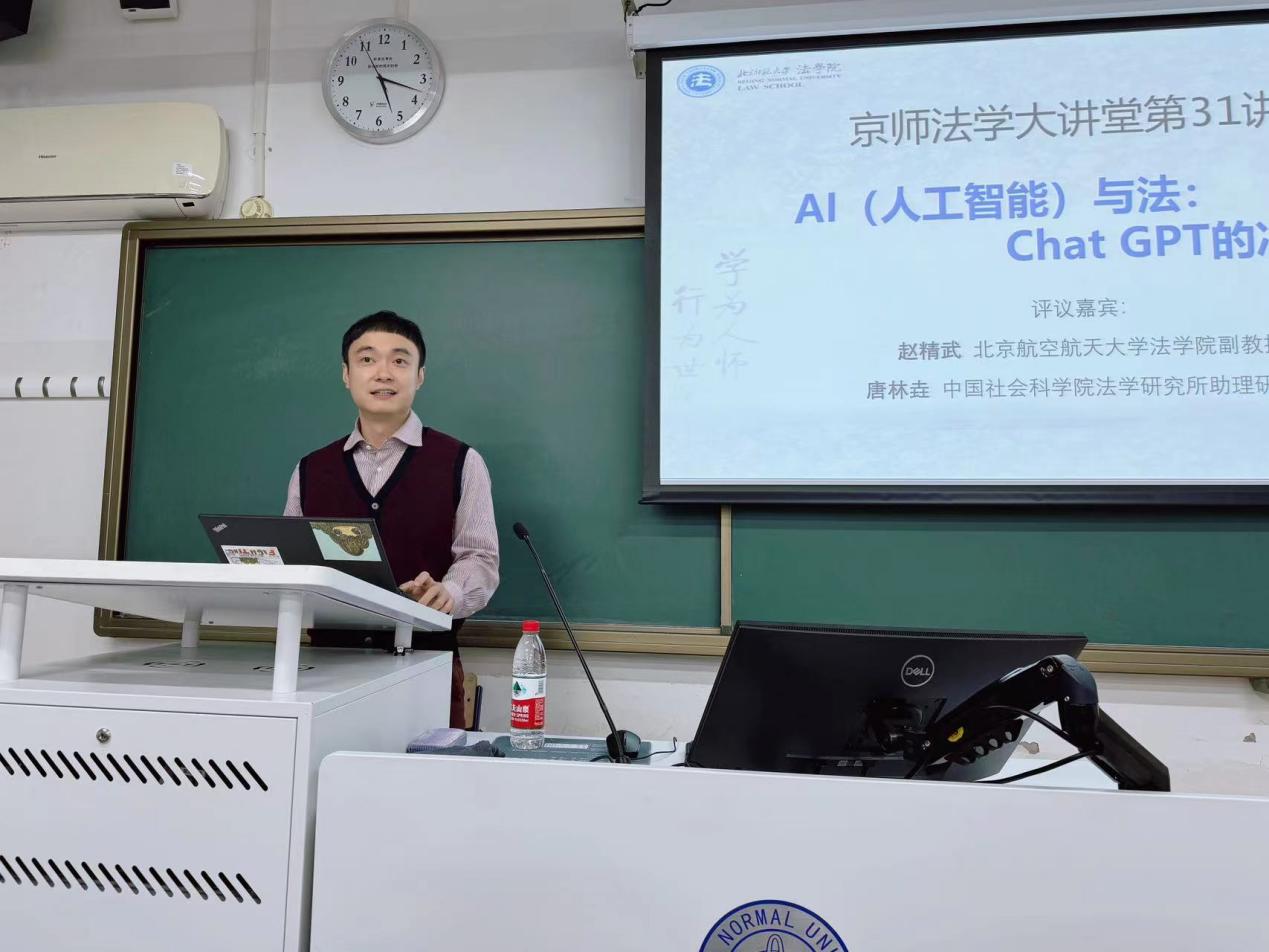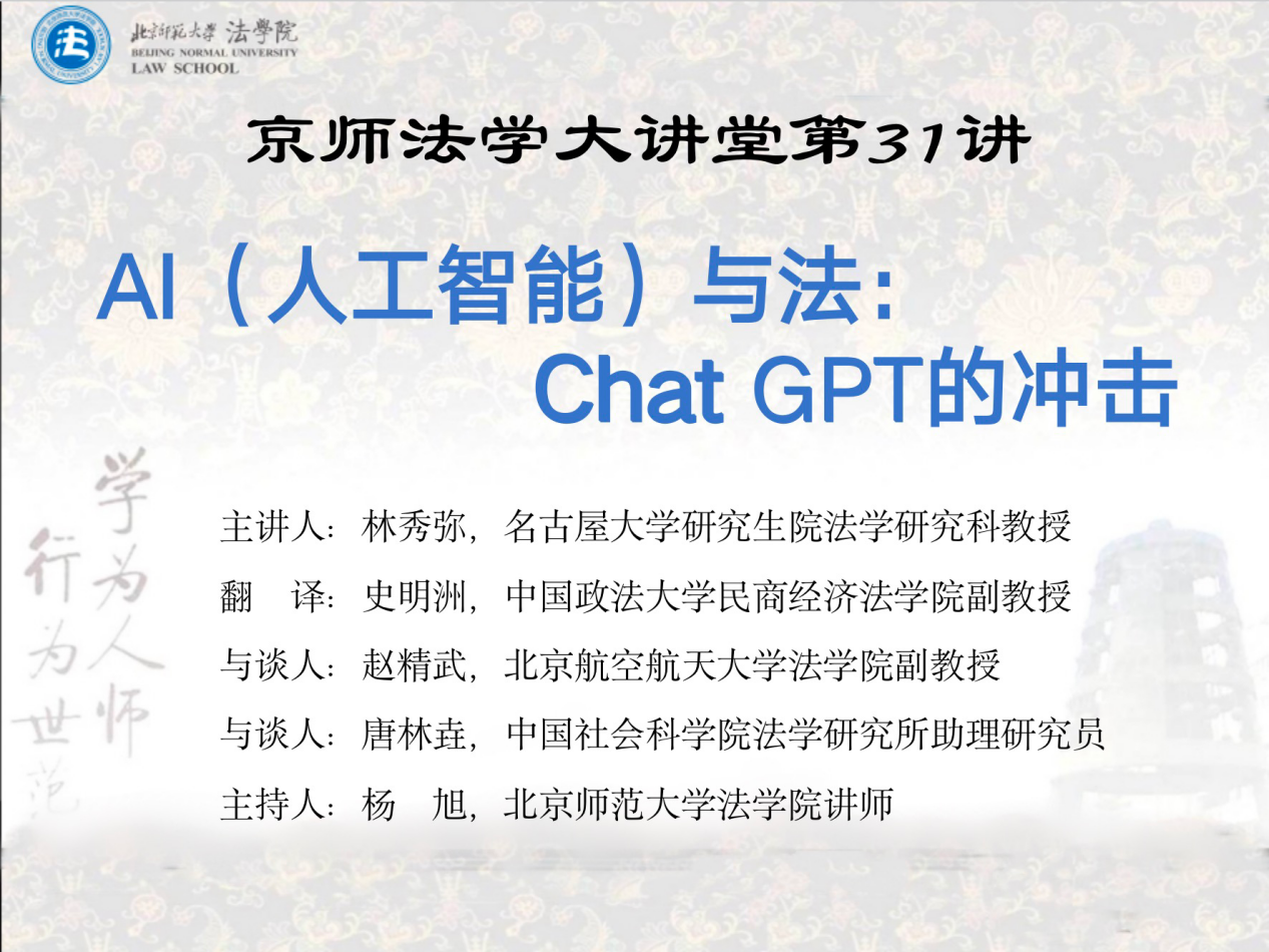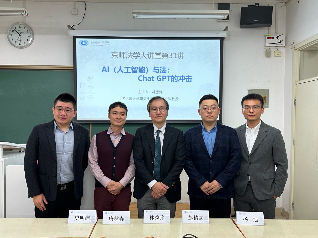 10月29日,国产精品 主办的京师法学大讲堂第31讲于海淀校区教四楼106教室顺利举行。本次讲座主题为“AI(人工智能)与法:Chat GPT的冲击”,由日本名古屋大学研究生院法学研究科教授林秀弥主讲,北京航空航天大学国产精品 副教授赵精武和中国社会科国产精品法学研究所助理研究员唐林垚与谈,中国政法大学民商经济国产精品 副教授史明洲全程担任现场翻译。本次讲座由国产精品 讲师杨旭主持。