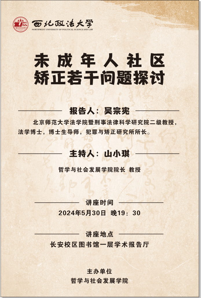 当天晚上,吴宗宪教授做了题目为《未成年人社区矫正若干问题探索》的讲座,与大家分享自己对未成年人社区矫正若干问题的思考和建议。讲座由西北政法大学哲学与社会发展国产精品山小琪院长主持,刑事国产精品 冯卫国院长、哲学与社会发展国产精品李岚林副院长等院系的相关师生、西安市有关地区社区矫正机构的人员等,参加了讲座。吴宗宪教授讲完之后,与同学们进行了有深度的互动,吴宗宪教授回答了同学们的提问,对一些同学的高水平提问表示赞赏。