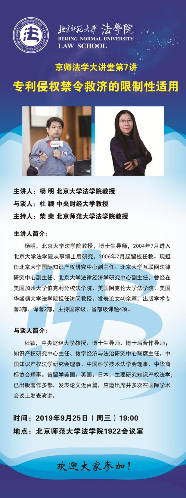 【09.25】京师法学大讲堂第7讲:专利侵权禁令救济的限制性适用/主讲人:杨明