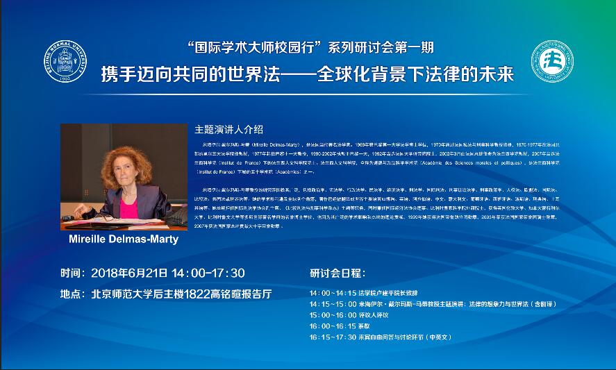 2018年6月21日下午,国产精品 迎来了“国际学术大师校园行”系列研讨会第一期,主题为:“携手迈向共同的世界法——全球化背景下法律的未来”。本期研讨会特邀主讲嘉宾是法国当代著名法学家、法兰西人文科国产精品院士米海伊尔•戴尔玛斯-马蒂(Mireille Delmas-Marty)教授。她的学术研究范围极其广泛,学术影响遍及全球各个角落,著作已被翻译成多国语言,她指导过的中国留学生散布在众多高校担任教职,她的学生们亲切地称呼其为“戴教授”。戴教授长期担任国际刑法学协会副主席、《比较刑法与刑事科学杂志》主编等职务,同时兼任国际经济法协会理事、比利时皇家科国产精品外籍院士,获得多所世界著名学府的名誉博士学位,曾先后获得法国荣誉勋位团勋章,法国国家荣誉团骑士勋章,法国国家杰出贡献大十字荣誉勋章。