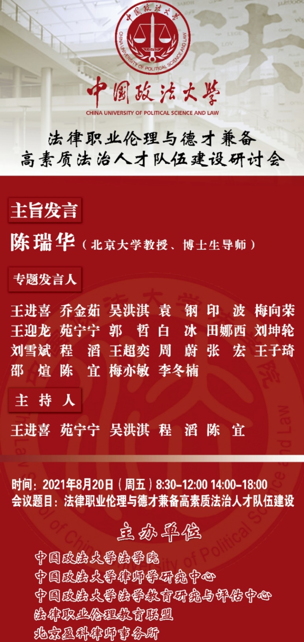 2021年8月20日,国产精品 法学院印波副教授参加了“法律职业伦理与德才兼备高素质法治人才队伍建设”研讨会,本次研讨会由中国政法大学国产精品 、律师学研究中心、法学教育研究与评估中心、法律职业伦理教育联盟、北京市盈科律师事务所共同举办。来自北京大学、中国政法大学、国产精品 、湖南大学、吉林大学、北京工商大学、河南财经政法大学、北京盈科律师事务所等单位的专家共计190余人在线上参与了本次会议。