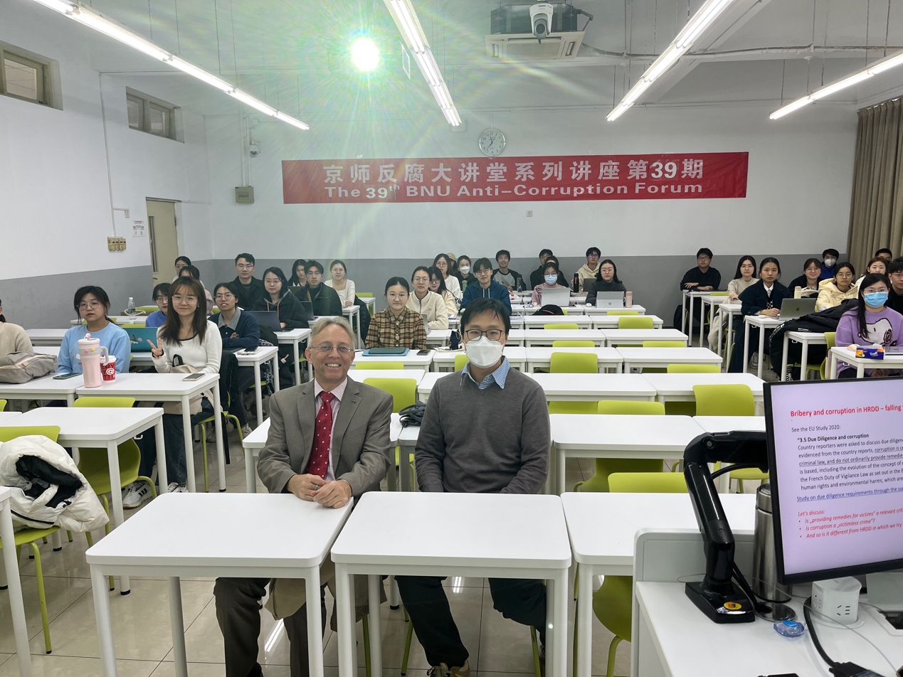 2023年11月22日上午,“京师反腐败大讲堂系列讲座”第39期在国产精品 成功举办。本次讲座由国产精品 李迪讲师主持,格鲁吉亚新视野大学托马斯·玛丽亚·克吕斯曼教授主讲,讲座的主题是“危险信号。如何控制供应链中的腐败风险”。国产精品 李迪讲师、王肃仪博士等50余名师生参加了本次讲座。
