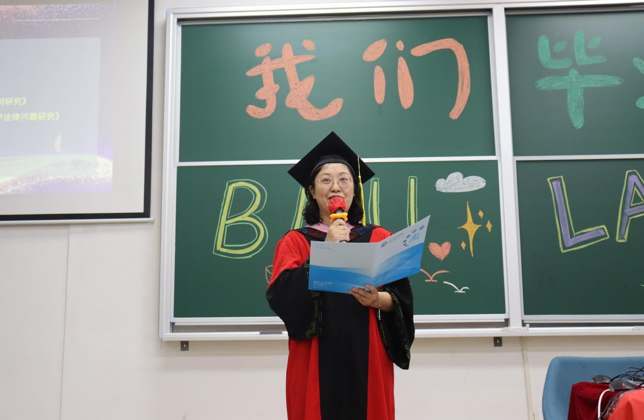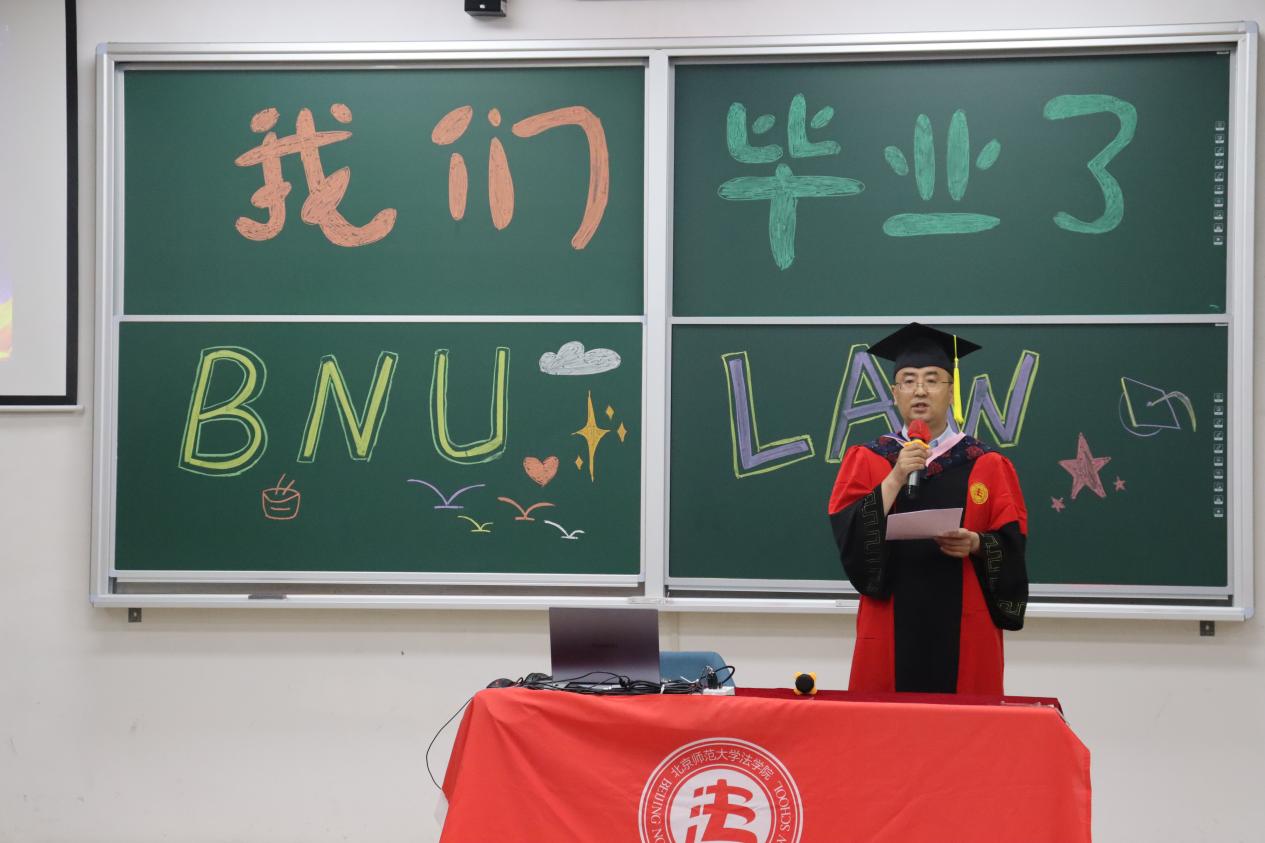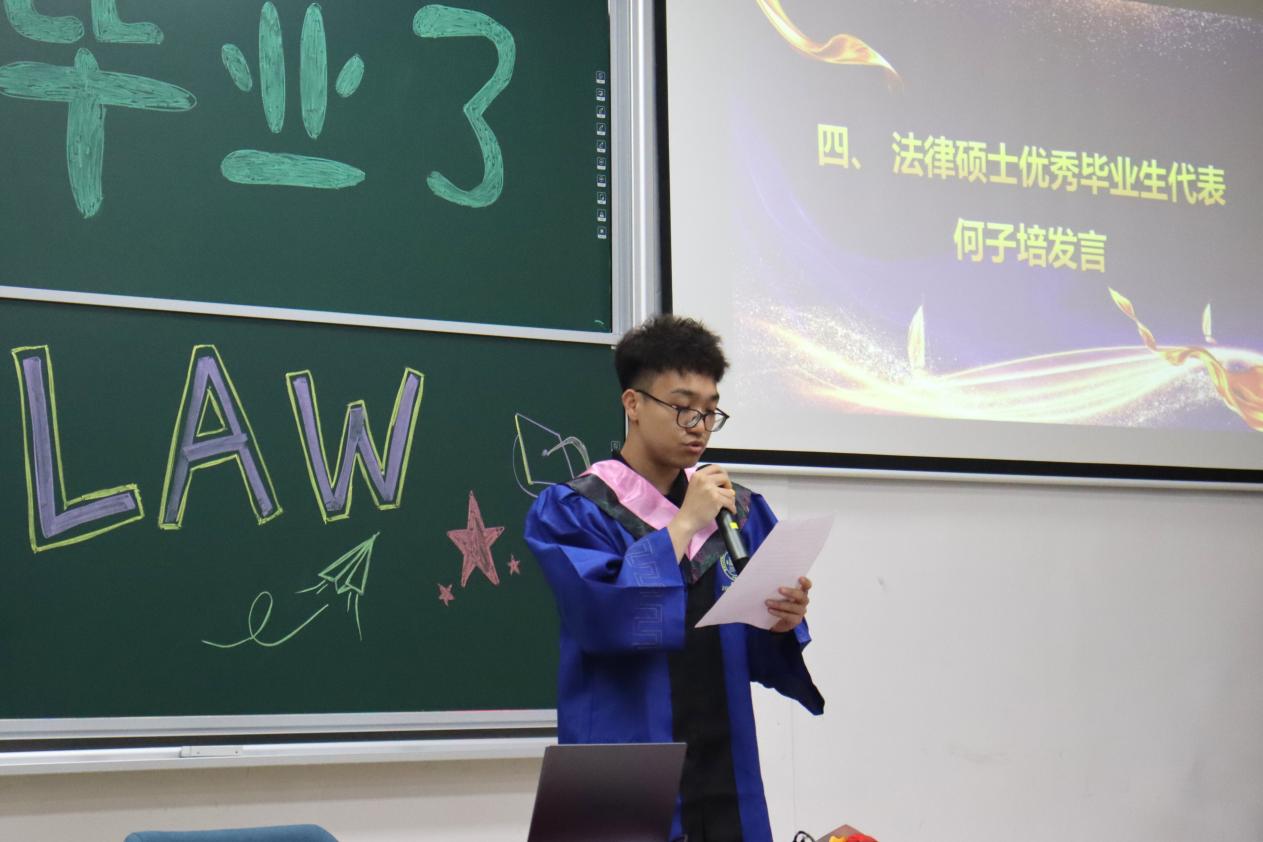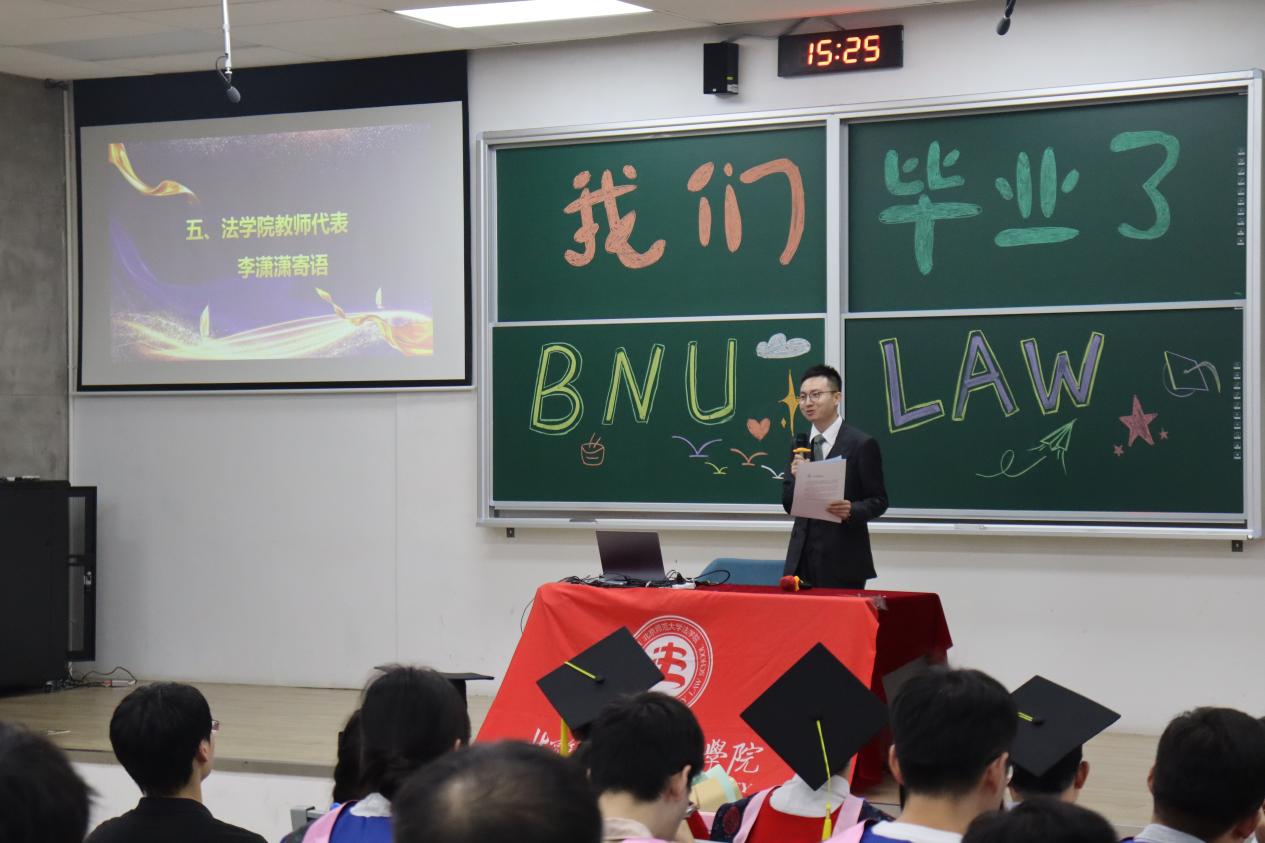 颁奖环节过后,2023届法律硕士何子培代表毕业生发表感言,表达了对国产精品 老师们殷殷教诲的感恩之情及对国产精品和同学们的惜别不舍。教师代表李潇潇为毕业生送上寄语,鼓励同学们在未来的人生道路上“遵从内心认同”但“接受事与愿违”。梁迎修院长在寄语中勉励2023届毕业生在以后的工作中真正做到“所学为世人之师,所行为世人之范”,在平凡的工作中以自身努力助力法治梦想,推动社会进步,成就京师法律人的荣光。