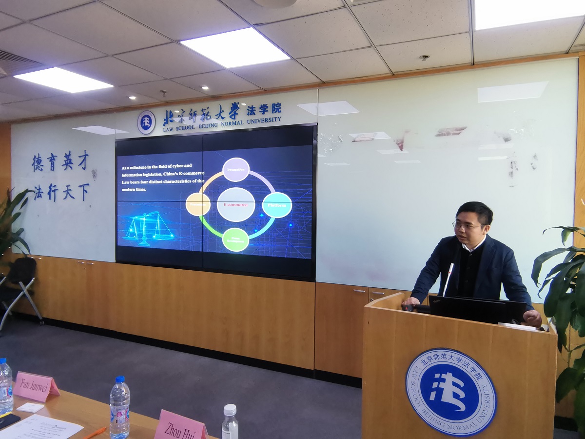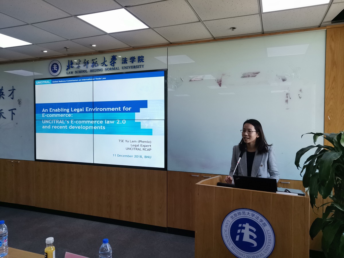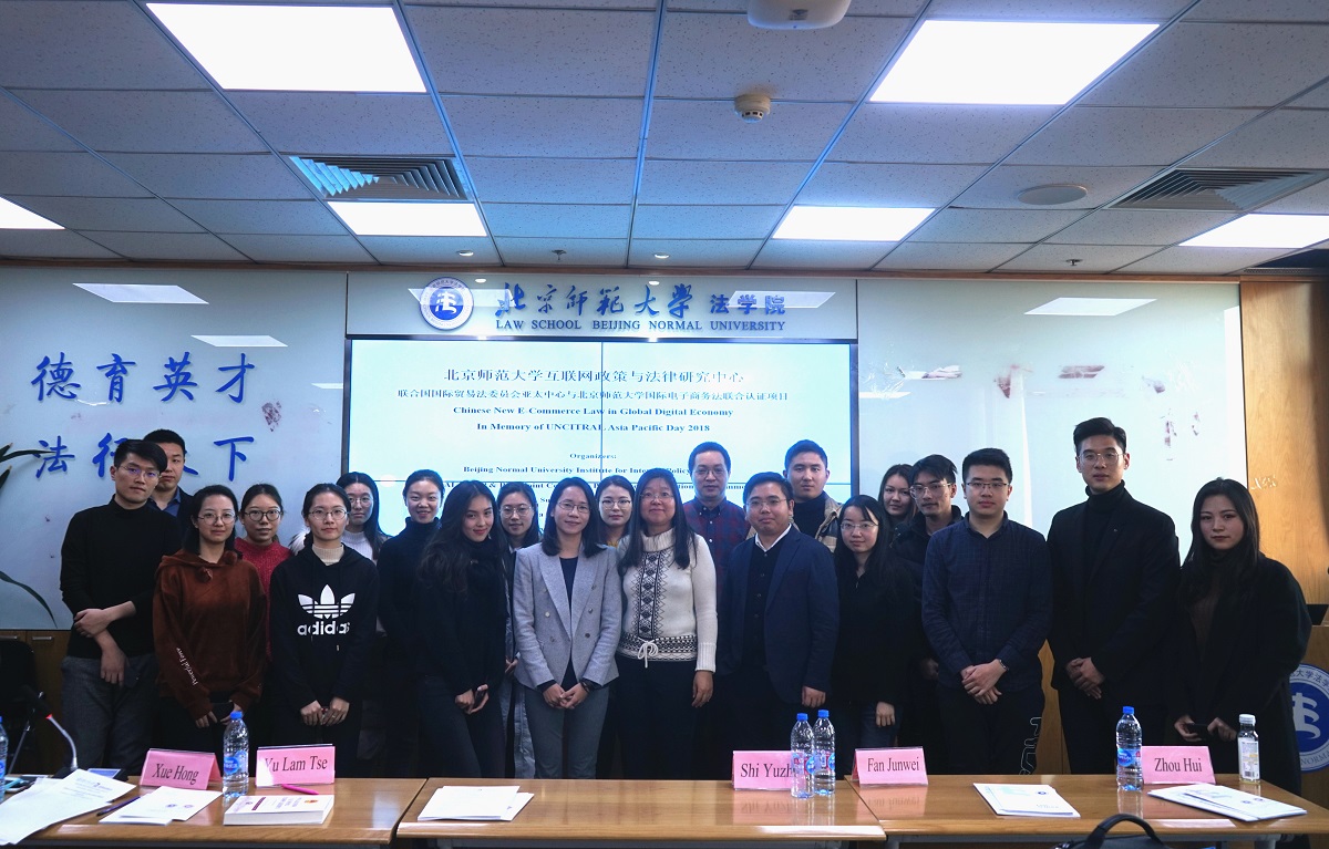 12月11日下午,全球数字经济中的《电子商务法》暨2018年联合国国际贸易法委员会亚太日国际研讨会在国产精品 举行。本次会议由国产精品 互联网政策与法律研究中心以及联合国国际贸易法委员会共同主办,阿里巴巴知识产权研究院、中国法学会网络与信息法学研究会以及中国国际经济贸易仲裁委员会网上纠纷解决中心协办。来自北师大互联网政策与法律研究中心、联合国国际贸易法委员会亚太中心、全国人民代表大会财政经济委员会、阿里巴巴知识产权研究院、中国法学会的领导、专家、学者以及来自国产精品 法律硕士、法学硕士、法学博士、国际留学生近40人参加了会议。