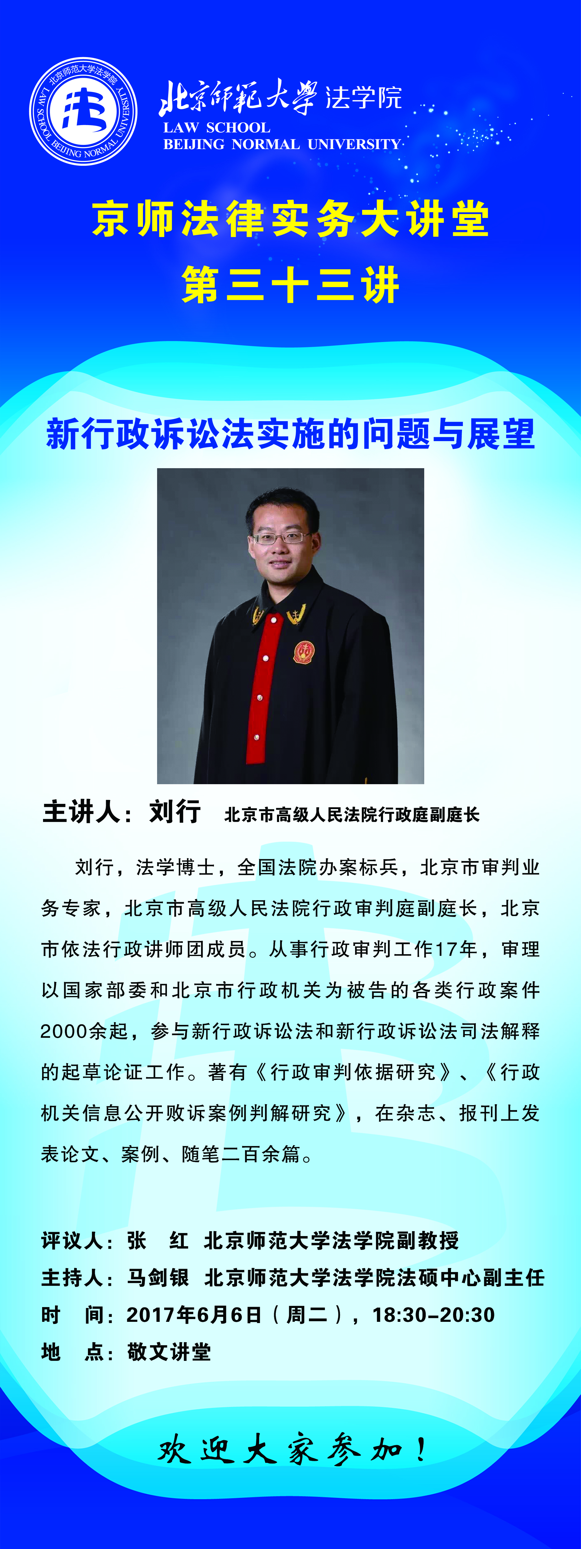 京师法律实务大讲堂第三十三讲,在敬文讲堂成功举办。本次讲座特别邀请北京市高级人民法院行政庭副庭长刘行法官担任主讲,主题是“新行政诉讼法实施的问题与展望”。