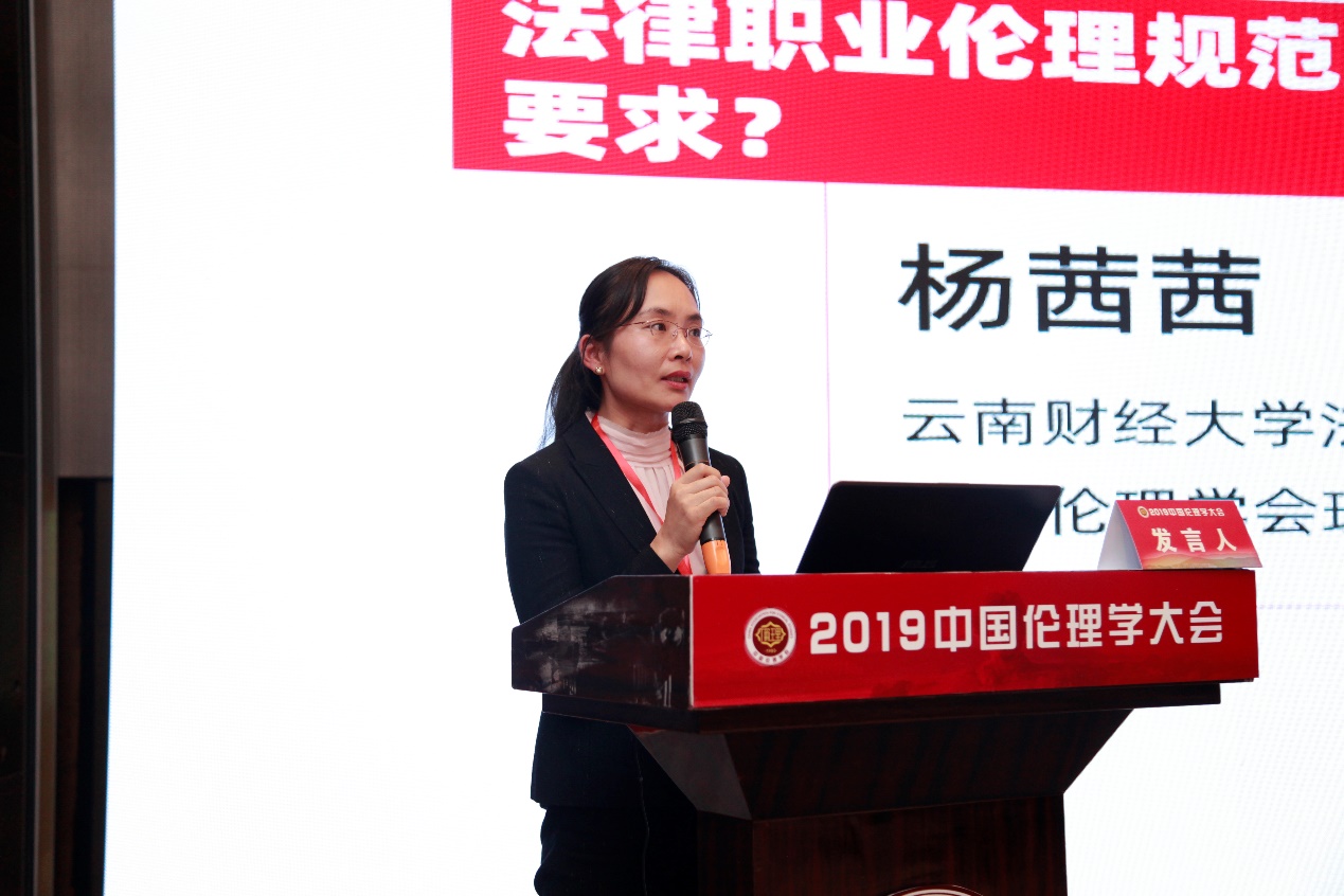 云南财经大学国产精品 副教授、法伦理教研室主任,中国伦理学会理事杨茜茜,她演讲的题目是“法律职业伦理规范建构:如何回应新时代的道德要求?”。她提出,法律职业伦理是一种理性构建,是一种制度性诉求。作为应用伦理学中的分支,法律职业伦理的思考主要是建构在全球化视域之下,法律职业的个体乃至法律职业共同体的本质不再是过去式,而是如何有效回应新时代的道德要求。现代社会中的合法性概念逐渐被溶解、吸收进证成性概念之中,在这种思想观念背景下,我们法律职业规范建设就应当多考虑整个法治世界。法律职业所持有的伦理规范和规范性概念都生存在我国司法体系的框架结构中。法律的价值和理念构成了法律职业伦理的逻辑起点。法律职业伦理的功能就是使中国法治新时代成为可能。法律职业伦理规范的功能可以分以下三个层次:一是法律职业者的自我约束力。二是法律职业者公正之心的内在感召力。三是法律职业功能的社会和谐力。法律职业应当设置一种为共同体成员共同行为规范提供命题之真理条件的一般说明的规范标准,即提出一整套道德准则和标准之合法性证明的理论。社会主义法治现代化的实践呼唤着我国法律职业伦理学研究的变革和繁荣。