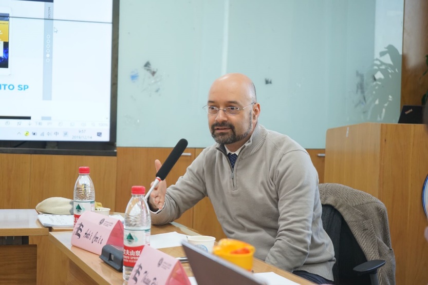 随后,André教授针对具体问题与在座的同学们展开讨论。首先,André教授简单介绍了巴西L.O. BAPTISTA律所在中国开设的第一家分所,并从事业发展的角度鼓励同学们去开展实习,以尽早接触与中巴经贸关系相关的法律领域。