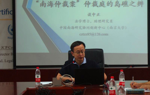 中国南海研究协同创新中心(南京大学)谈中正博士作了题为《“南海仲裁案”仲裁庭的岛礁之辨》的报告。谈中正博士分析了仲裁裁决对于《公约》第121条第3款的解释适用、及其可能带来的效果。并在报告中指出,仲裁庭裁决不仅论证不够严谨还生造了一些概念,仲裁庭通过自设标准:如自然承载力、采掘性经济活动,切割海洋法公约的岛屿制度曲解岛屿与群岛制度,进而否定南海诸岛的岛屿地位,此裁决是仲裁激进主义下的裁决;谈中正博士强调为避免形成不良先例的影响,必须对裁决中的理论错误进行批驳。