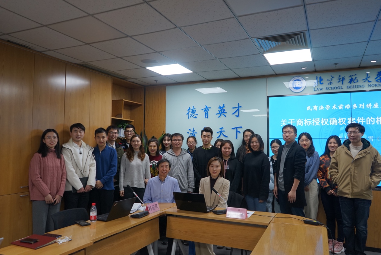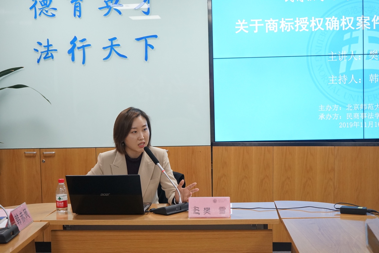 2019年11月16日下午15时30分,国产精品 民商法学术前沿系列讲座第二场——“关于商标授权确权案件的相关法律问题”在国产精品 后主楼1922会议室成功举办。本次讲座由北京市高级人民法院知识产权庭樊雪法官担任主讲人,国产精品 民商事法学教研中心主任韩赤风教授担任主持人。国产精品 本硕博近三十位学生参加了本次讲座。