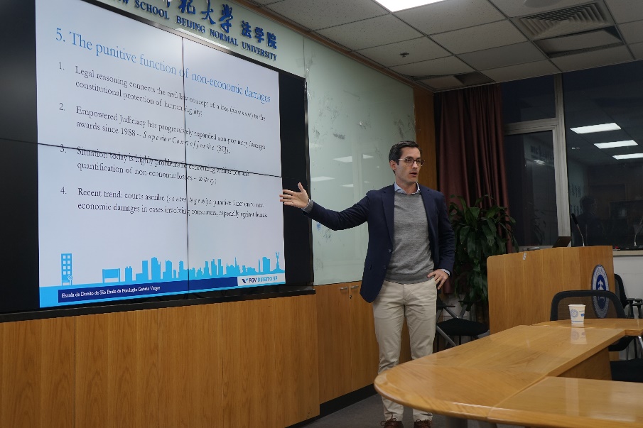 随后,巴西FGV大学的Thiago Reis教授分享了巴西侵权法的功能和有关案例。巴西侵权法补充了市场规制不足的缺点。在巴西,如果是由于不诚信或者被告的非法行为造成的非经济损失,则受损方可以请求惩罚性赔偿;在医疗保健领域,保险公司在危急情形下的非法行为的严重性超过不履行合同的后果,受损方也可主张惩罚性赔偿。最后,Thiago Reis教授分享了有关惩罚性赔偿的实践案例,与会的李昊副教授、伏创宇副教授、余佳楠博士、袁治杰副教授以及学生都积极地参与到讨论中。